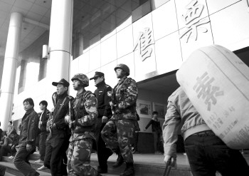 4日,荷枪实弹的济南特警、武警、巡警等多警种出现在济南长途汽车总站。 本报记者 左庆 摄