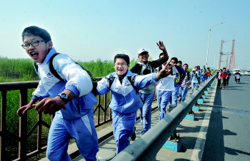 在高校取消3000米以上运动会项目,中学体育课避免安排有风险的课程时,山大附中却坚持举行远足活动达十年之久,学校不怕担风险吗?校长赵勇说:“在行动之前,我们就仔细地勘察过路线,逐一排查行进中可能出现的问题,周密组织老师、家长、交警在所有路口值守,保证万无一失。”