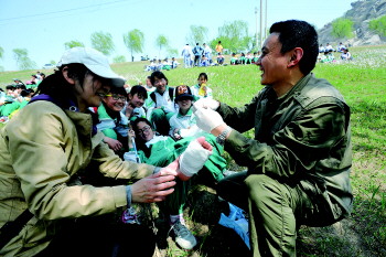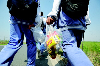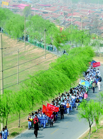 30公里,对同学们来说,并没有什么具体的概念,但当一个同学说出“就是绕操场75圈”时,有相当一部分同学担心走不完全程。中午休息时,他们的情绪还是相当高涨,但下午的路程,才是对他们严峻的考验。随着终点的临近,同学们的疲劳感成倍增加,许多女生脸上的表情已不再轻松,个别已有不适的症状,但让她们乘车时,她们断然拒绝。“挺住,意味着一切”,另一面旗帜鼓舞着所有的同学,他们继续前行。