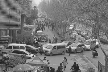 ◤济南市中心医院门前接送病人的车辆经常会排到马路上,严重影响道路通行。(资料片)