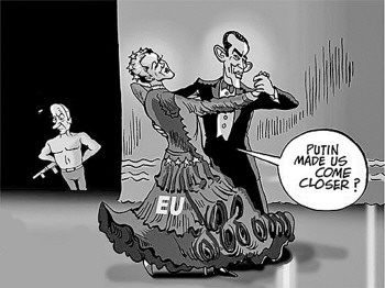 美国总统奥巴马对裙子上写有“欧盟”的舞伴说:“普京让我们更亲密了吗?”而在幕后,拿着枪的俄罗斯总统普京冷冷地看着。