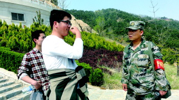 在梁永双的劝导下,小伙子交出了偷偷带上山的打火机。 本报记者 金夏瑞 摄
