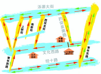 据改造方案,西双龙街为由北向南单行,南新街和上新街为由南向北单行。不难看出,如此改造之后,西双龙街、南新街、上新街将和文化西路、泺源大街形成多个交通微循环。大“长方形”的边缘可以循环行驶,其中多个“长方形”的边缘也可以循环行驶。