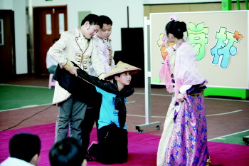 15日,在洮南路小学,学生们在表演童话剧《渔夫与金鱼》。当日,该校第二届“萌芽杯”校园戏剧节开幕,孩子通过角色扮演,在趣味中提高艺术想象空间。 本报记者 张晓鹏 摄影报道
