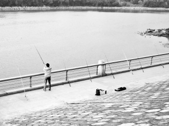 作品描述:男子在河边摆开10根鱼竿进行钓鱼,开展规模作业。