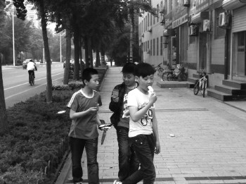 一些小学生从商店内购买零食后,结伴走在路上。