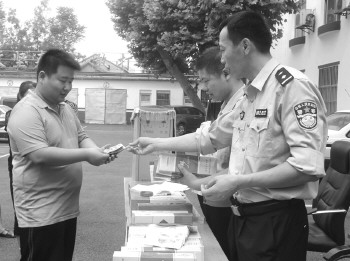 6月14日,汶上县公安局刑警大队举行赃物发还仪式,将追缴的赃物和赃款返还给受害人。近日,该局刑警二中队破获了系列盗窃门市部案,追缴回香烟108条、现金15829元。破案后,汶上警方将赃款赃物全部归还受害人。 本报通讯员 宋红顺 摄
