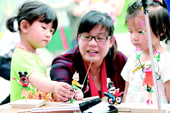 小朋友和家长观看民间艺人制作的面塑工艺品。