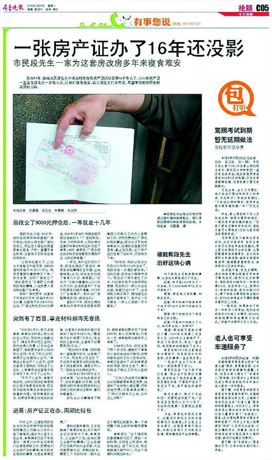 握着这张房产证,段先生又想起了这16年来的心酸。“记者同志,要是没有你们报社帮忙,我这证恐怕还没影呢!”