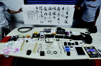 7月14日上午,胶州市公安局三里河派出所的会议室里,一张长约4米的桌子上摆满了玉石饰品、手表、金银首饰、手机、笔记本电脑、照相机等物品,170余件物品看上去就像一个“小金库”。这些物品中,除了9.8万元的现金外,还包括各类名牌手表7块,三星W999、 苹果5S等名牌手机6部,苹果、索尼等名牌电脑3台,钻石戒指、金银项链、手镯等首饰50余件,玉器饰品20余件,另外还有纪念钱币、购物卡等。据介绍,所有这些财物,都是从14日打掉的一个流窜入室盗窃团伙处缴获的,涉案价值达数十万元。