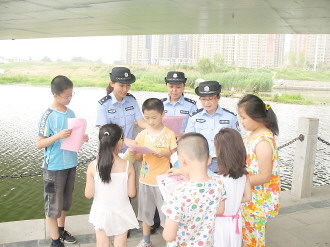 连续的高温,荆河岸边聚集了不少来此纳凉的少年儿童。为了有效防止青少年儿童溺水事故的发生,27日,龙泉派出所组织社区民警积极开展暑期防溺水宣传工作,预防溺水事件发生。    本报记者 张冬梅 本报通讯员 丁军 摄影报道