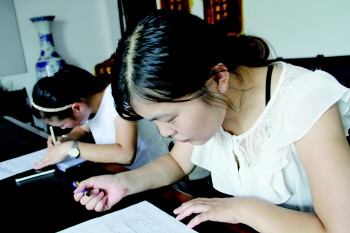 美女们正在填写报名表。