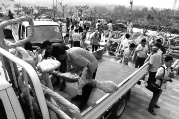 29日,工作人员和村民们一起搬运健身器材。 本报记者 张永斌 摄