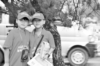 小报童王世聪和王世鹏在路口向记者展示他们的风采。