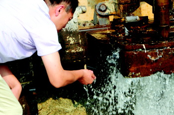 7月26日下午,打井专家们带着专业的设备来到罗家堂村,在水井流出来的水流上做出一个三角堰,专家们用米尺测量水流。“现在水量每小时在8.6方左右,没想到出水量这么大。”山东省地矿工程勘察院(八○一队)钻探公司副主任兼主任工程师李传磊说。