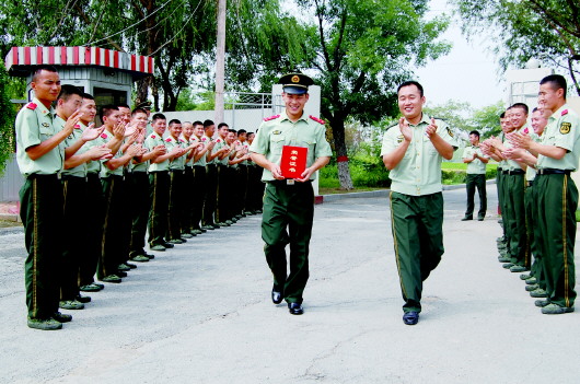 7月31日,武警滨州市支队直属大队一中队李强荣获滨州市首届政法优秀人才奖,也是该奖项唯一的获得者。今年初,滨州市设立了政法优秀人才奖,这在滨州政法史上是第一次,在全省也属首创。图为李强获奖归队后,战友们夹道欢迎。