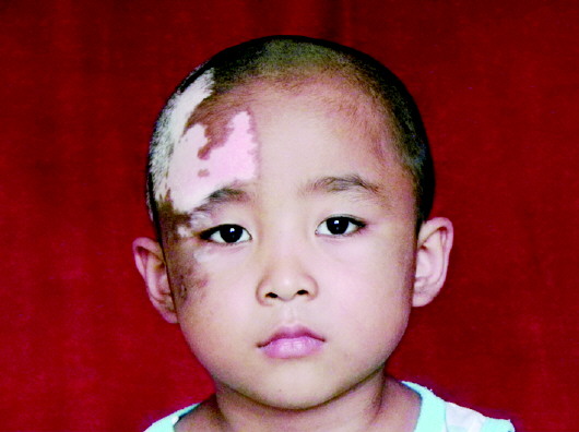 ◆患病经历:张国豪今年9岁,2011年7月份,他的前额右侧及头部右侧患上了白癜风。此偏侧类型白癜风异常难治,因治疗不及时、不规范,他的白斑迅速扩散。得病后,村里许多家长误以为传染,不让自己的孩子再和他一起玩,他从此变得自卑不爱说话。