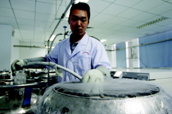 山东省脐血库工作人员将液氮注入临时储罐内。