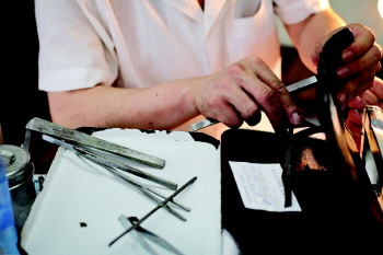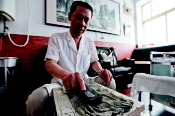 △修脚刀必须保持锋利,磨刀是每天必需的功课。