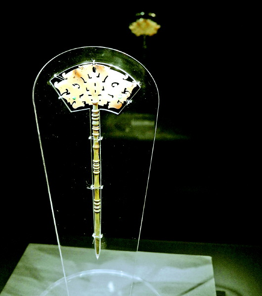 其中有一件玉簪独立成柜展出,吸引了大量观众尤其是女性观众好奇的目光,这件玉簪生成年代为距今4600年前至4000年前的龙山文化时期,出土于山东临朐县西朱封史前遗址。