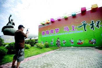 14日,已有游客在啤酒城内拍照合影。 本报记者 张晓鹏 摄