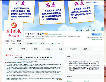 □同时,齐鲁晚报《今日青岛》新浪官方微博也全新改版升级;除固定推送每天《今日青岛》上版新闻,还不定时推出微博活动,如转发活动微博赠实物礼品等。