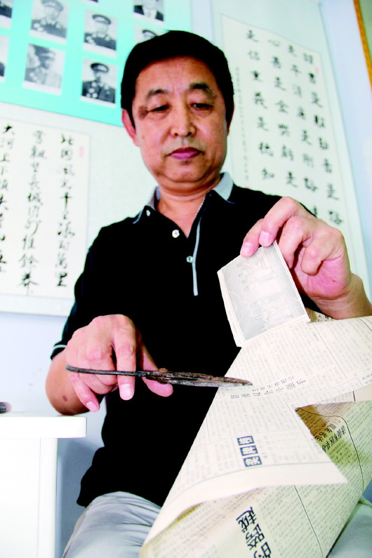 刘荣焕在专心致志剪报。