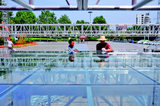 14日,人民广场,工作人员在搭建一个长约14米、宽12米、高1.3米的巨型玻璃舞台。工作人员介绍,舞台将用至10月份,原有舞台因不能满足演出需求已被拆除。