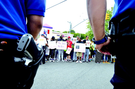 23日,在美国纽约市斯塔滕岛,警察在示威游行现场执勤。 新华社发