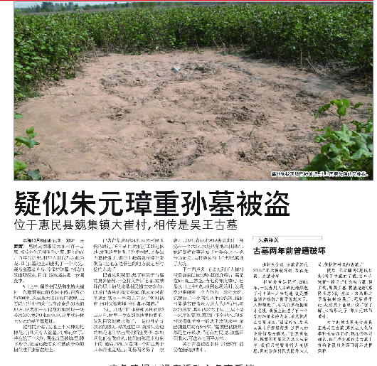 ◥2013年10月9日本报关于《疑似朱元璋重孙墓被盗》的报道。