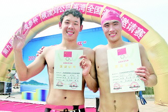 8月30日,由威海市体育局主办,本报今日威海和威海市游泳协会共同举办的“双举海参杯”2014威海横渡刘公岛海湾全国游泳邀请赛开赛,来自全国20个城市的431名游泳爱好者齐聚威海。21岁的济南小伙张泽萌以54分37秒的成绩第一个游完全程到达终点,摘得男子甲组桂冠。图为男子甲组冠军张泽萌(左)和亚军李鹏达(右)。