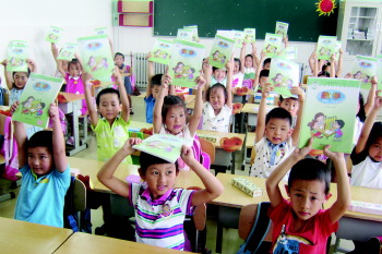 浮山路小学一年级学生展示发的新书本。 李珍梅 摄