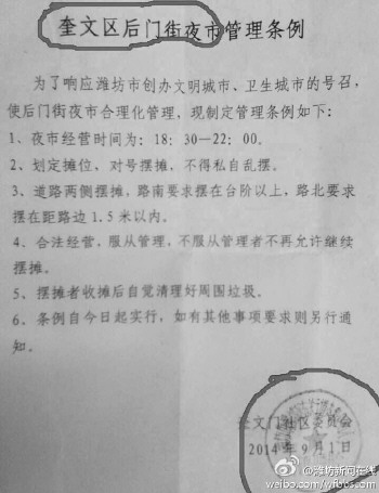 有市民反映,最近在泰华城附近后门街夜市上摆摊的业主收到了一份《奎文门后门街夜市管理条例》,上面称为了响应潍坊市创办文明城市,卫生城的号召,使后门街夜市合理化管理,制定了一些管理条例。记者发现,条例共有6条,分别规定了摆摊的时间、位置和垃圾处理的管理办法。