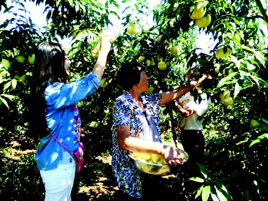 ↑立秋以来,马山镇的万亩雪桃已经渐入成熟期。4日,记者来到马山镇的桃园,看到很多人已经在采摘品尝甜嫩多汁的雪桃。与此同时,马山的核桃、玉米、花生等农作物也成熟了。 本报见习记者 贾威 摄