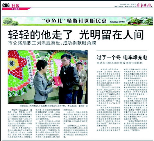 关于刘洪胜本报曾以《体检指标异常,他选择了隐瞒》《身患重症,他选择捐献眼角膜》《轻轻的他走了,光明留在人间》为题进行连续报道。刘洪胜是205高速公路滨州管理处滨州南收费站的一名普通职工,2013年被确诊为骨髓增生异常综合征,由于病情恶化,转化为白血病。离世前的刘洪胜曾说,本来他想把他的全部器官捐出去,捐给学校,捐给医院,让人们作为医疗研究用。后来知道自己得的是血液病,其他器官都不能用,只有眼角膜可以捐献。就在今年4月22日,身患白血病的他在捐献眼角膜的志愿书上郑重地签上了自己的名字,于23日20时左右逝世。