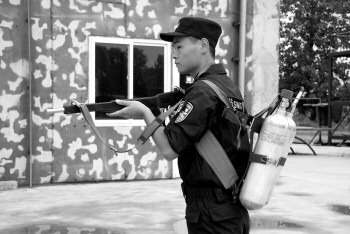 “背负式防暴喷雾驱散器里面装有刺激性气体,犯罪分子吸入后,眼睛流泪,无法施暴。”特警队员说。