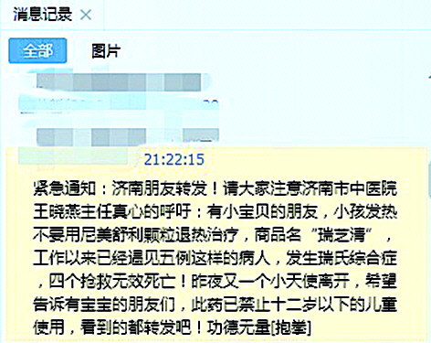 “紧急通知:济南朋友转发!请大家注意济南市中医院王晓燕主任真心的呼吁:有小宝贝的朋友,小孩发热不要用尼美舒利颗粒退热治疗,商品名“瑞芝清”,工作以来已经遇见五例这样的病人,发生瑞氏综合症,四个抢救无效死亡!昨夜又一个小天使离开,希望告诉有宝宝的朋友们,此药已禁止十二岁以下的儿童使用,看到的都转发吧!”在微信朋友圈看到此消息的市民彭先生将信将疑,但由于涉及孩子用药安全,他还是点了转发键。