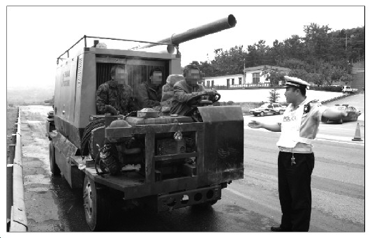 “其实就是一堆破铁焊接成的运输工具。”9月14日上午,在省道242线公安检查站,执勤民警查获一辆运输打井设备的“怪车”:几根方管和破铁板焊接的底盘,一台12马力的柴油机作为动力,驾驶员座椅绳捆索绑,铁皮支撑的方向盘来回晃悠,更要命的是刹车系统不灵敏,驾驶人接连踩了几脚,车辆才慢慢停住。在这辆濒临散架的“车”上,竟然坐着两名乘客。