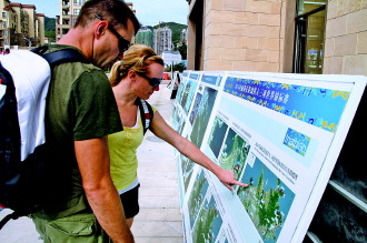▲外国运动员在看比赛线路。 记者 陈乃彰 摄