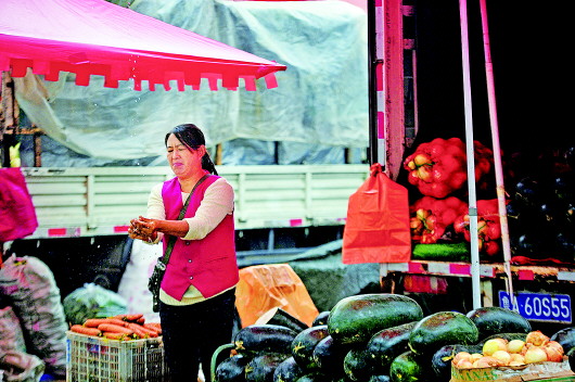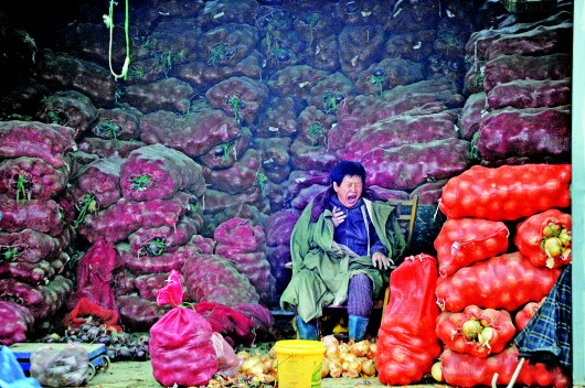 梦中盼客 17日,在济南七里堡蔬菜批发市场内,商贩曾大姐盖着棉衣打起了哈欠,她身后是堆得高高的洋葱(上图)。连日的阴雨天气导致气温下降,受天气影响市场上的菜价节节高升,前来买菜的人稀稀拉拉,不如往日。市场上行人寥寥,听着雨声,裹着棉衣,盼着顾客,不少商贩在无奈的等待中进入梦乡。雨一直在下,商贩用雨水洗洗手,准备吃饭(左图)。