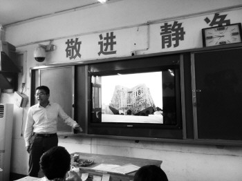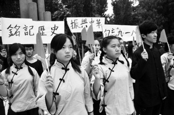 9月18日,在聊城大学,大学生们身着青年装再现“爱国学生示威游行”,举行“九·一八”事变爆发83周年纪念活动(右);聊城四中各班级召开“勿忘国耻 奋发图强”主题班会,以此缅怀先烈,铭记历史(下图)。
