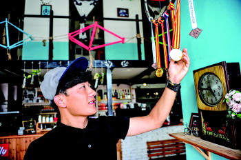 华子的咖啡店内摆放着很多自行车架,这些都是他的收藏,属于非卖品。咖啡店的墙上很多关于自行车的照片,其中一张是华子参加比赛中的照片。多年的自行车生涯也让华子取得了不少成绩,华子手拿一块奖牌告诉记者,前不久他代表中国参加了东北亚跨国公路自行车巡回赛,顺利完赛并获得一枚奖牌。