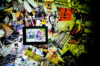 墙上很多关于自行车的照片,其中一张是华子参加比赛中的照片。