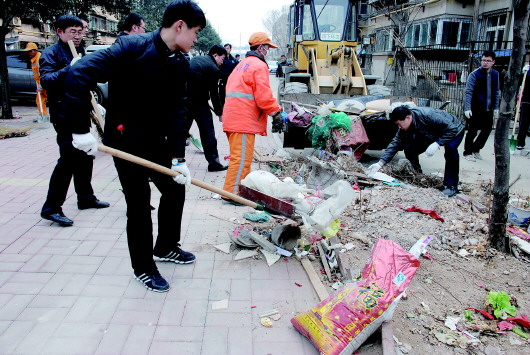 工作人员清理友谊苑社区积存垃圾。(资料片)
