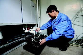 工作人员在调试湛山路3号的空气源热泵。
