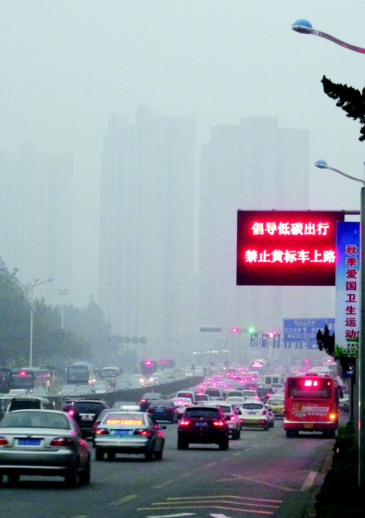 30日,雾霾笼罩下的济南一度接近严重污染。当天济南环保局发布本市PM2.5来源解析结果,本地污染源占比七成左右,其中燃煤占比最高为27%,其次是扬尘占24%。为重拳治污,省环保厅对魏桥热电厂等11企开出155万罚单,济南规定从2016年起,全市禁行黄标车。 本报记者 左庆 摄