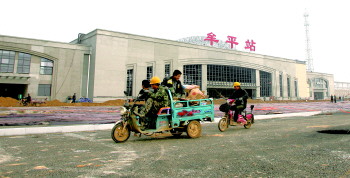 11日,几名工人乘车经过主体已经完工的牟平站。 本报记者 赵金阳 摄