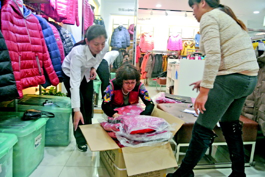 志愿者和商场人员一起将棉衣打包。 本报记者 王红星 摄
