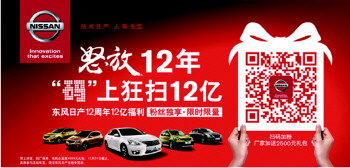 大友集团东风日产年底清库,全系7.5折起售,阳光仅需5.98万!东风日产12年周年庆,12亿感恩答谢,扫描下方图片中二维码,再送2500元购车礼包!