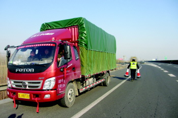 交警摆设路障,对占用应急车道的货车进行检查。 本报记者 刘光斌 摄